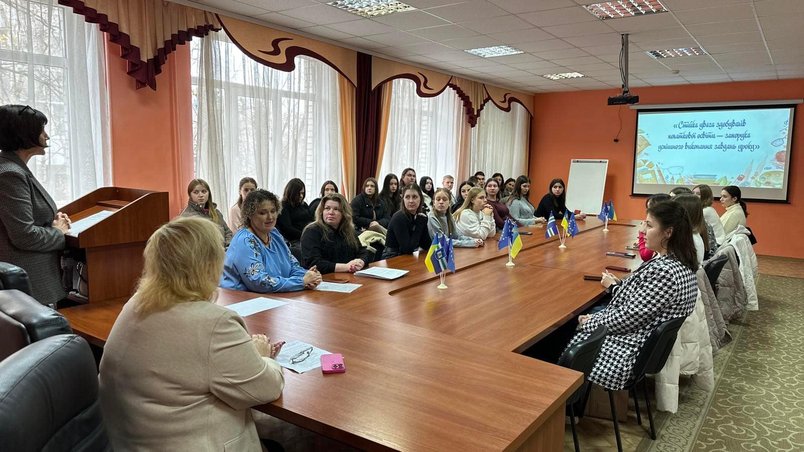 Викладачі кафедри іноземних мов, кандидат педагогічних наук, доцент Тетяна Северіна та старший викладач Юлія Рибачук разом зі студентами факультету початкової освіти та філології Крістіною Туранською (ПО- 31) та Ольгою Поперечною