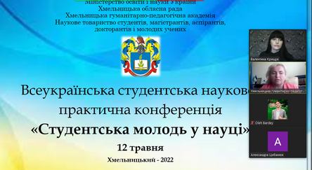 12 травня 2022 р. відбулась всеукраїнська студентська науково-практична конференція «Студентська молодь у науці», яка традиційно проводиться до Тижня науки в Хмельницькій гуманітарно-педагогічній академії. Тематика доповідей учасників заходу засвідчила актуальність вивчення різних галузей