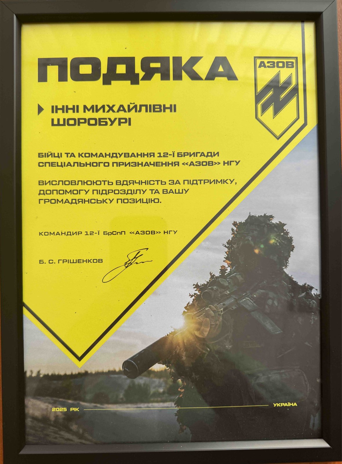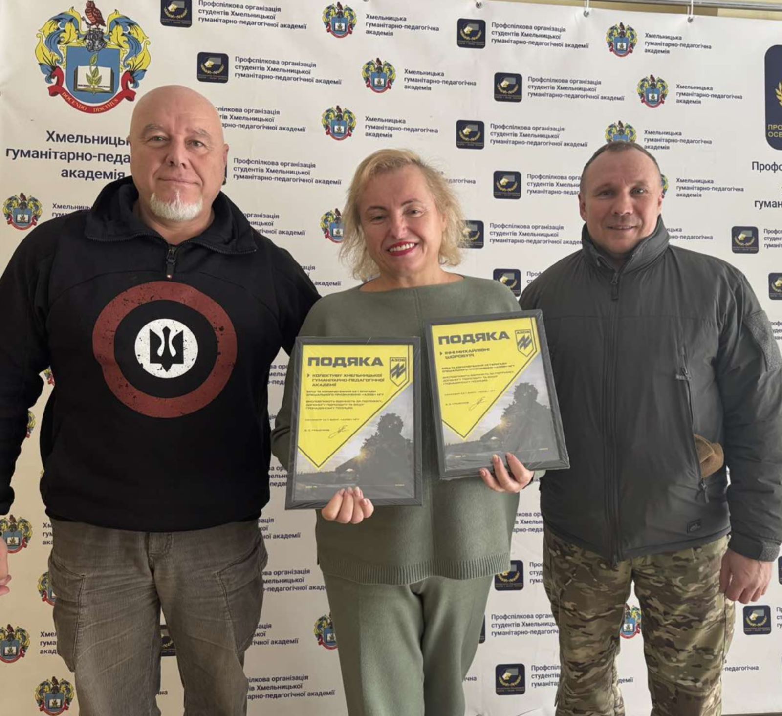 Виконуюча обов’язки ректора Хмельницької гуманітарно-педагогічної академії Інна Шоробура отримала Подяку від бійців та командування 12-ї бригади спеціального призначення «АЗОВ» Національної гвардії України.