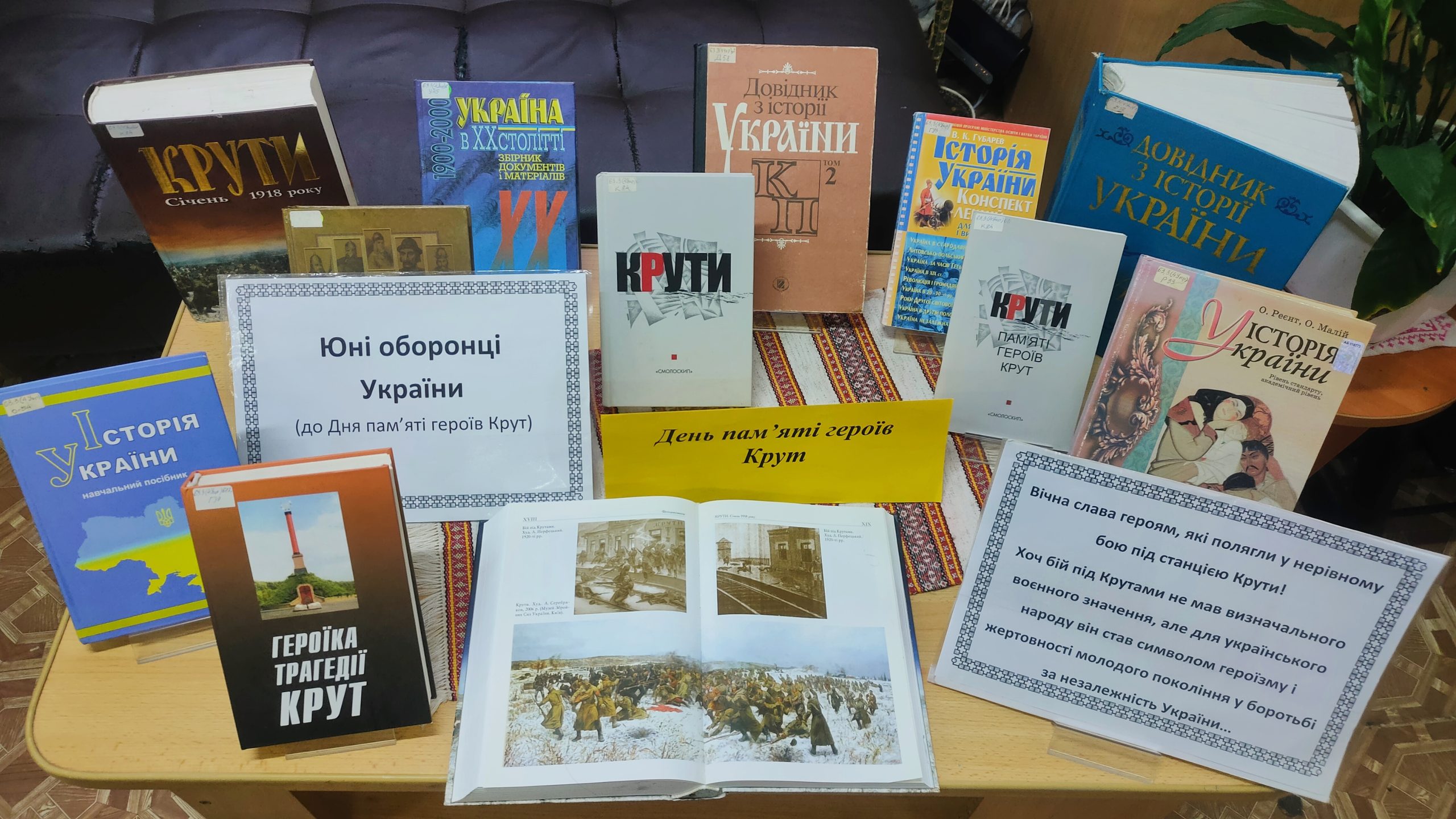 З метою вшанування пам’яті Героїв Крут та збереження історичної пам’яті бібліотекою академії підготовлено тематичну книжкову виставку, у якій висвітлено перебіг подій бою під Крутами, історичний контекст та значення цих подій для становлення української державності.