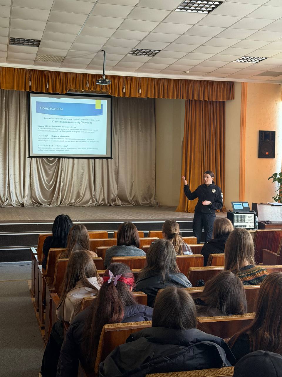 16 березня в актовій залі Хмельницької гуманітарно-педагогічної академії відбулася інформаційно-просвітницька зустріч здобувачів освіти з інспектором з комунікації районного відділу поліції Вірою МАЗУР