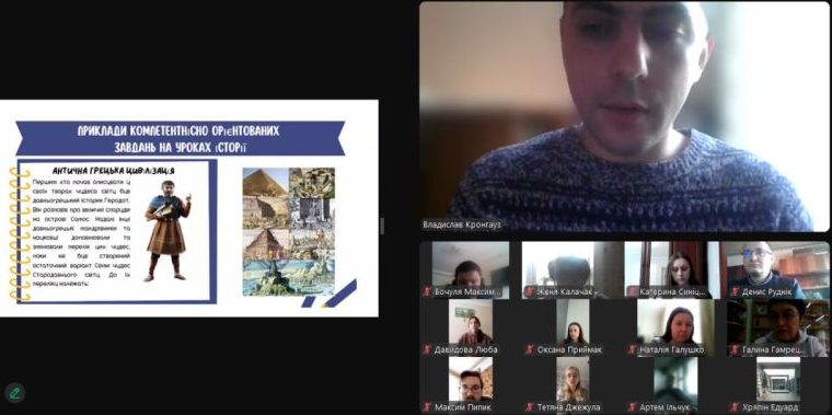 11 лютого 2025 р. в рамках проєкту «Схід і Захід – разом» майбутні вчителі історії долучилися до онлайн-заняття з фахової методики (викладачка Галина ГАМРЕЦЬКА), яке провів учитель історії ліцею № 3 Салтівського району м. Харкова Владислав КРОНГАУЗ – тренер-педагог НУШ, сертифікований учитель історії, співавтор модельних навчальних програм і підручників громадянської та історичної освітньої галузі, спікер освітнього проєкту «На Урок», розробник проєкту «Histlab» для самостійного вивчення історії, фіналіст Національної премії Global Teacher Prize Ukraine – 2024, переможець Харківського міського конкурсу «Учитель року – 2025», член навчально-методичної ради ДУ «Школа Супергероїв», методист з розробки Cath-Up проєкту Go Global з подолання освітніх втрат.