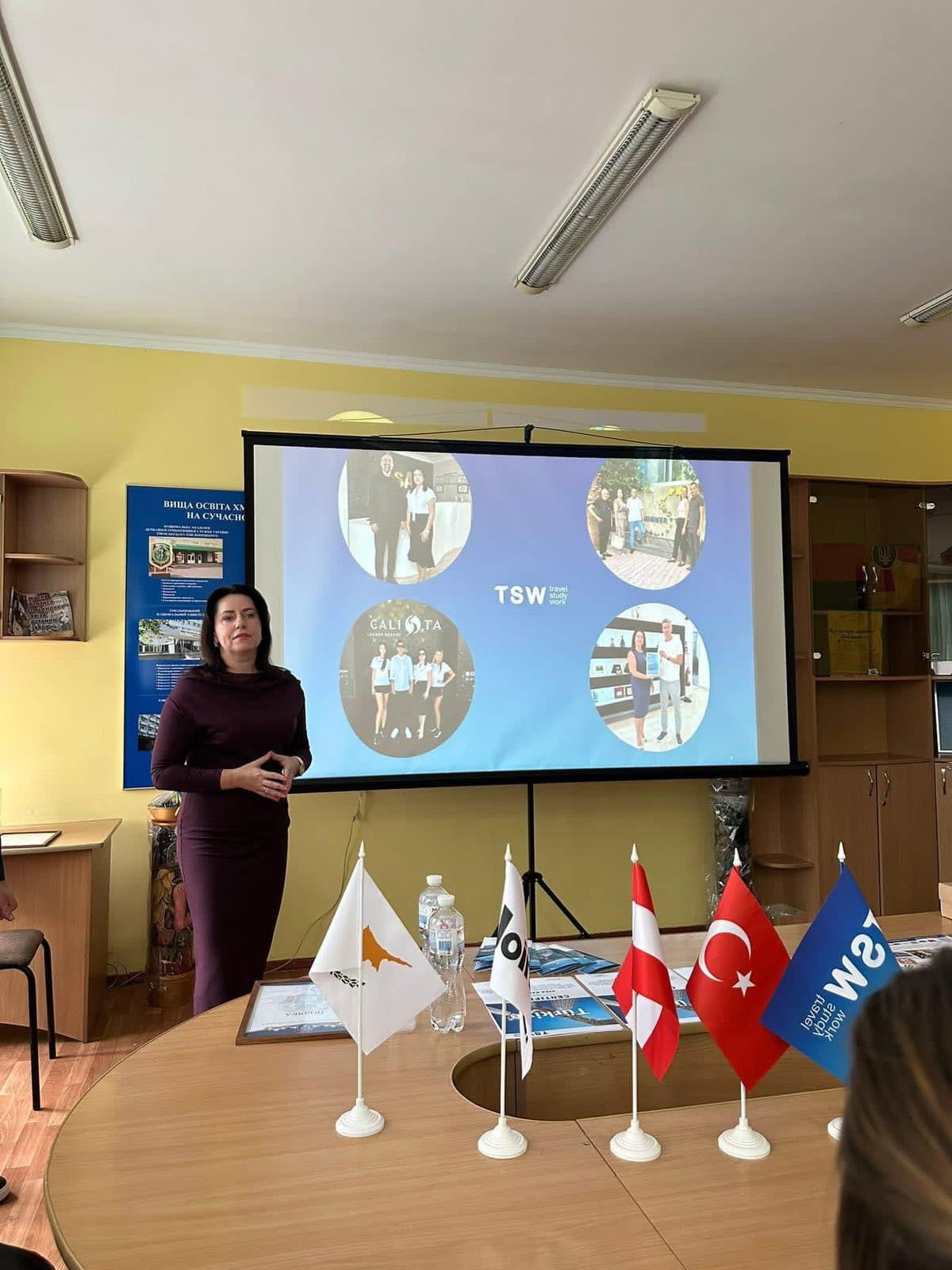 Пані Руслана Жовтані ознайомила присутніх з історією створення, основними напрямами діяльності та досягненнями компанії Travel Study Work. Спільно з Валерієм Болкуном вона вручила сертифікати про проходження міжнародних практик студенткам кафедри: Юлії ОКОВИТІЙ, Ангеліні КАЗМІРЧУК та Вірі КАМЕНЯР, відзначивши їхню відповідальність, активність і високий рівень підготовки.
