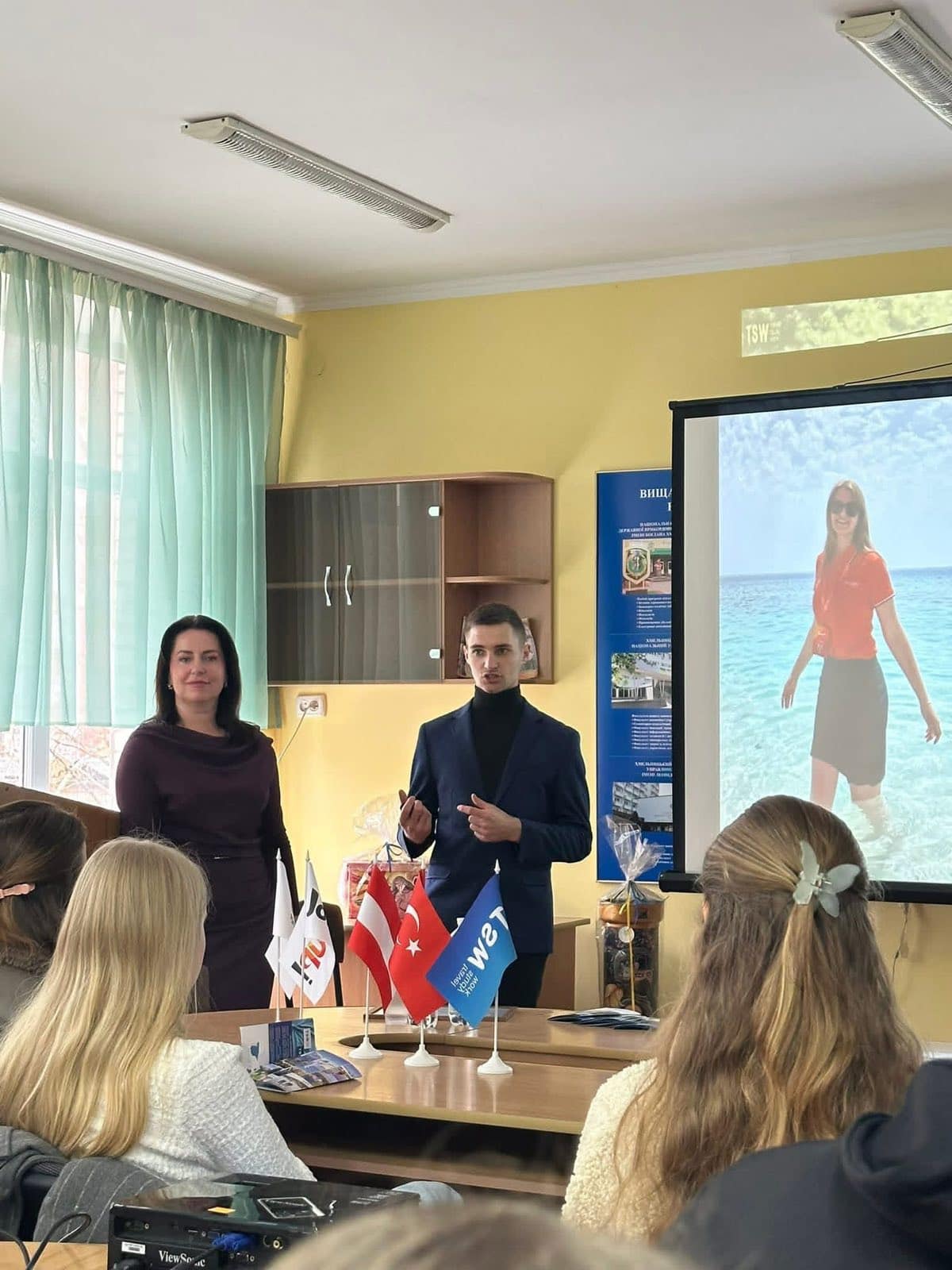 У своєму виступі Валерій Болкун презентував актуальні програми міжнародних стажувань у таких країнах, як Туреччина, Болгарія, Греція, Чорногорія, Іспанія, Туніс, Італія, Словаччина та інші. Він також представив можливості працевлаштування для студентів за напрямами туристичного супроводу, анімації, які дозволяють здобути цінний професійний досвід, розширити світогляд і відкрити двері до нових культур і глобальних перспектив.