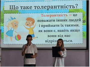 Захід проводився в рамках тижня толерантності.Це був не звичайний урок, а яскраве, веселе свято, яке семикласники підготували для молодших школярів, – з цікавими іграми, повчальними сценками про дружбу та повагу, конкурсами та піснями про доброту.