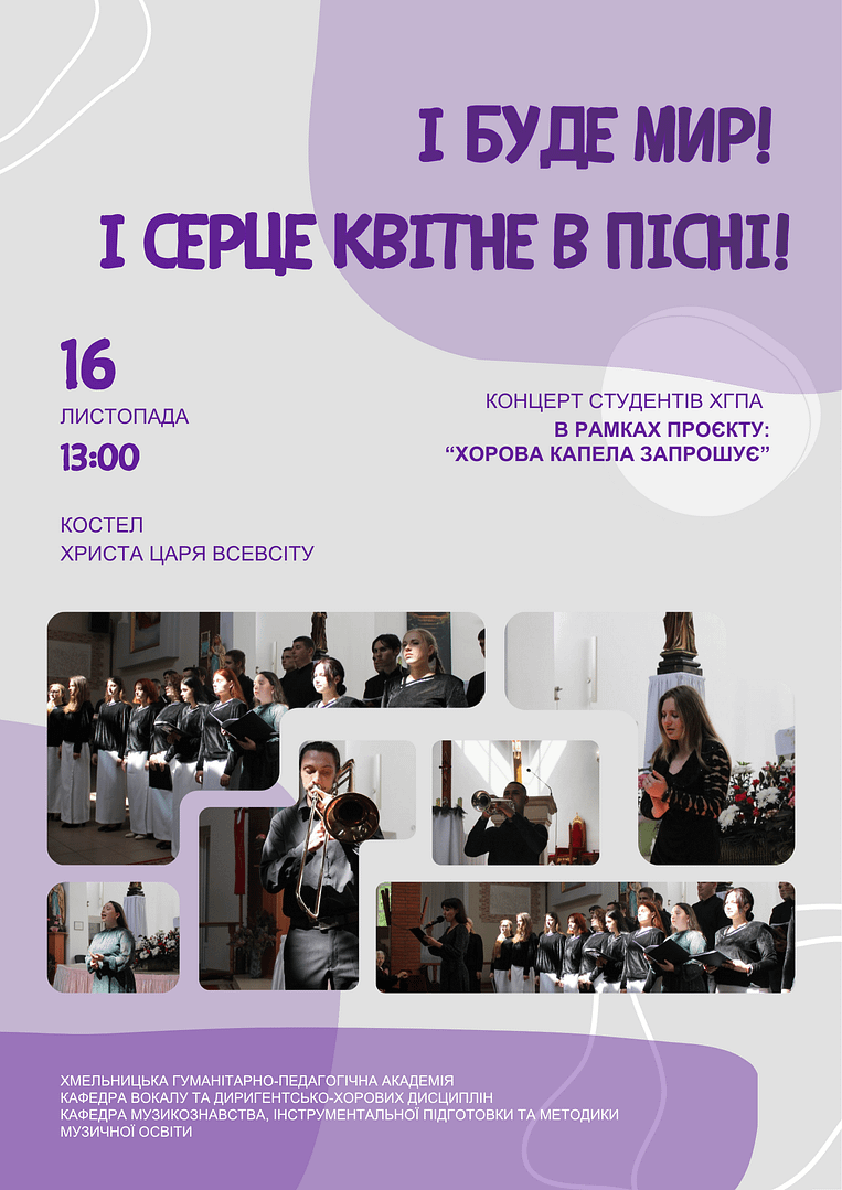 16 листопада2025 року у костелі Христа Царя Всесвіту відбувся концерт «І буде мир! І серце квітне в пісні!» за участі здобувачів освіти музичних спеціальностей гуманітарного факультету Хмельницької гуманітарно-педагогічної академії, зініційований колективом хорової академічної капели ім. Віктора Толстих під орудою Росіни Гуцал. Ця творча подія продовжила проєкт «Хорова капела запрошує», що увиразнює музично-просвітницькі орієнтири та спрямований на розкриття творчого потенціалу талановитих студентів факультету.