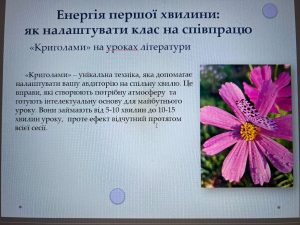 Любов ВАРАНИЦЯ, вчитель зарубіжної літератури Комунального закладу загальної середньої освіти «Ліцей 4 імені Павла Жука» продемонструвала авторську методику щодо можливостей використання сучасних візуальних методів на уроках зарубіжної літератури та представила практичні приклади системи завдань унікальної техніки «Криголами», яка налаштовує учнівську аудиторію на спільну роботу. Це своєрідна візуалізації літературних творів, які можна застосовувати під час вивчення кожної теми на різних етапах уроку.