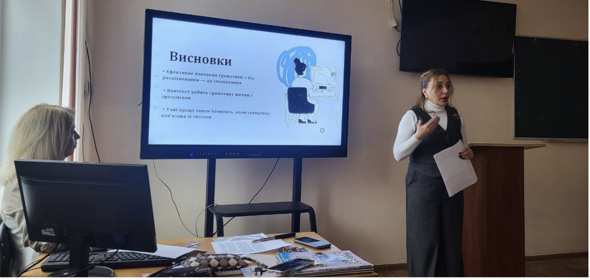 Ліна СМОЛЯК та Анжеліка БУРКА в інтерактивному форматі представили сучасні підходи до навчання граматики і лексики іноземної мови. Вони продемонстрували креативні вправи та прийоми, що активізують мовленнєву діяльність учнів, а також поділилися авторськими методичними розробками щодо ефективного засвоєння граматичних структур та лексичного матеріалу.