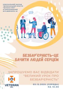 3 грудня 2025 року, до Міжнародного дня прав людей з інвалідністю, на базі комунального закладу Хмельницької обласної ради «Ветеранський простір Ветеран реалізовано всеукраїнську освітню ініціативу «Великий урок про безбар’єрність» для здобувачів освіти першого бакалаврського рівня за освітньо-професійною програмою А4 середня освіта (Фізична культура) Хмельницької гуманітарно-педагогічної академії.
