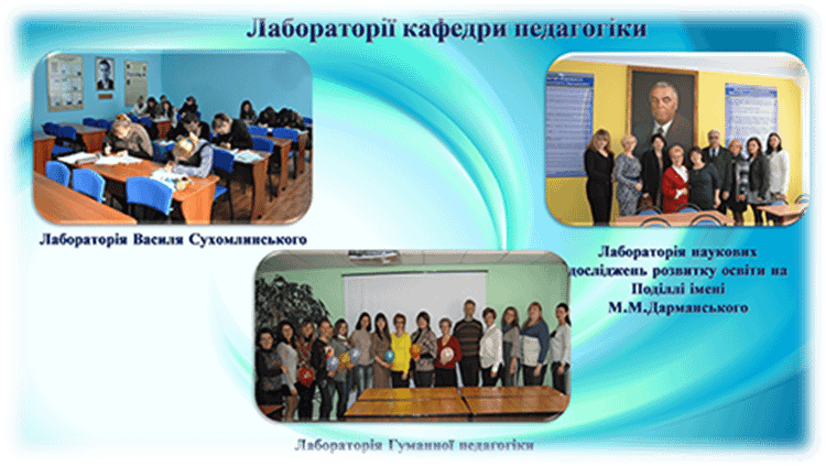Кафедра педагогіки має навчальні лабораторії (лабораторія В.О.Сухомлинського, Лабораторія гуманної педагогіки та Лабораторія М.М. Дарманського), які забезпечують її навчальну, наукову й виховну роботу.